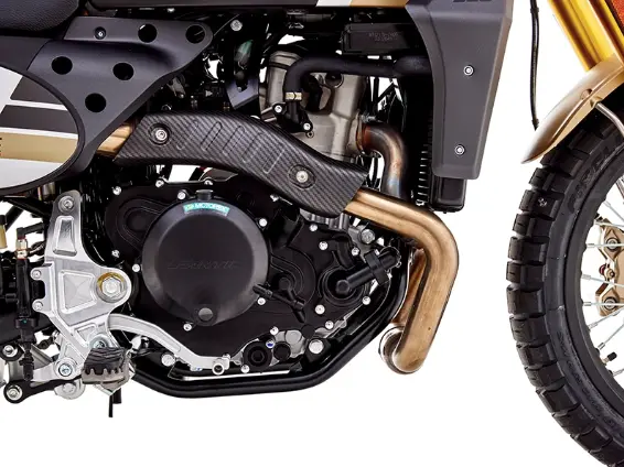 El motor monocilíndrico de 4 válvulas, refrigerado por líquido e inyección electrónica de combustible cumple ahora la normativa Euro 5. Ofrece un gran rendimiento sobre asfalto, combinado con eficiencia en pistas todoterreno. La unidad de control ECU tiene un mapeo actualizado, lo que garantiza una potencia del motor aún más suave en todas las revoluciones y también optimiza el rendimiento en términos de potencia máxima y par. El sistema de escape está fabricado en Italia por Arrow con silenciadores dobles cromados.