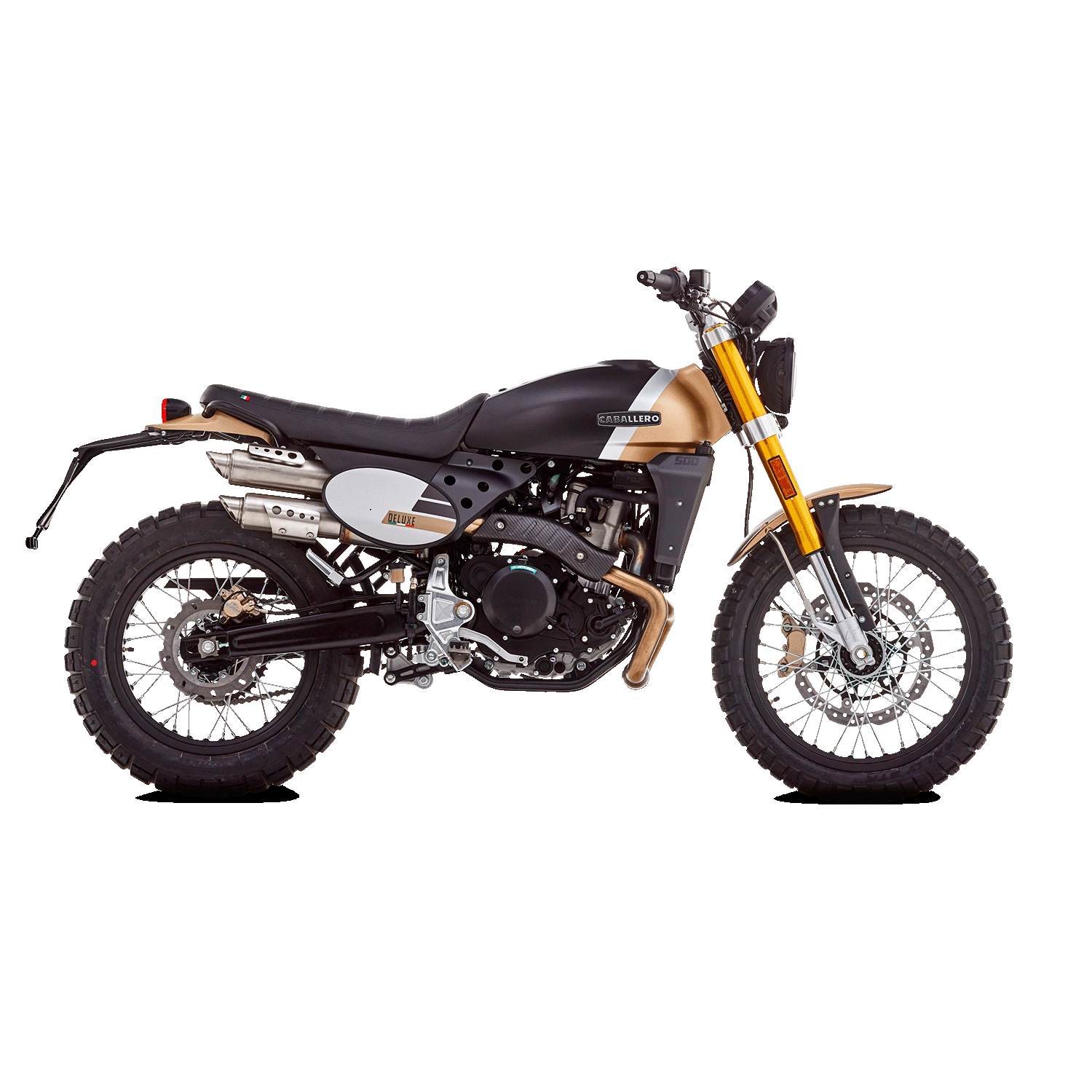 Caballero es una auténtica moto dual sport. La gama Caballero presenta un cuadro de tubo central de acero al cromo-molibdeno. Esta elección técnica favorece una vez más la ligereza, asegurando una agilidad y un confort increíbles. La horquilla delantera es una FANTIC FRS invertida de 41 mm, la suspensión trasera es una FANTIC FRS regulable. Las ruedas de radios de 19″ delante y 17″ detrás, equipadas con neumáticos de tacos Pirelli Scorpion Rally 110/80-19 y 140/80-17, le confieren un aspecto de auténtica scrambler. Los discos de freno Wave de 320 mm delante y 230 mm detrás y el ABS desconectable de doble canal Continental garantizan una gran seguridad en cualquier situación.