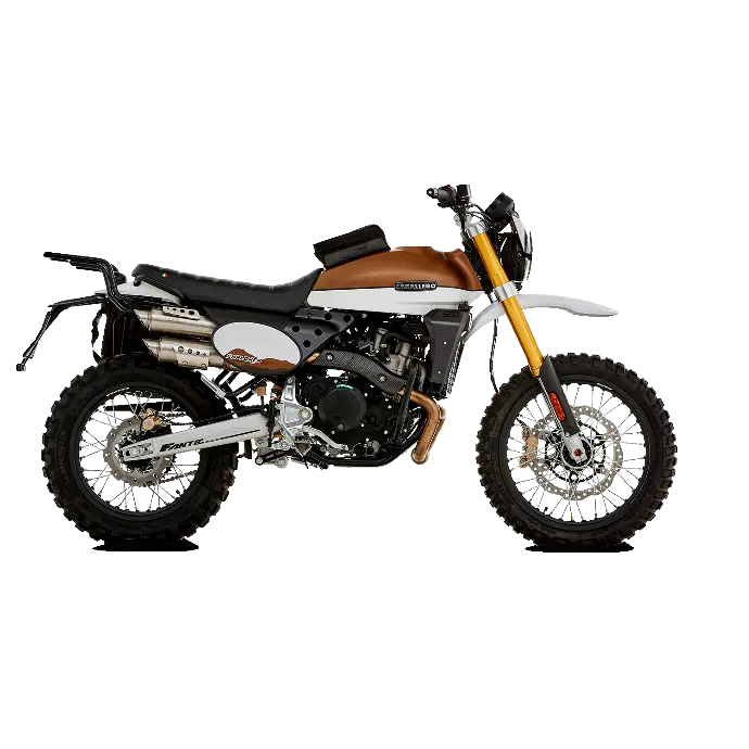 Caballero Explorer 500 es el modelo más off-road de la familia. La gama Caballero presenta un chasis de tubo central de acero al cromo-molibdeno. Esta elección técnica favorece una vez más la ligereza, asegurando una agilidad y un confort increíbles. La horquilla delantera es una FANTIC FRS invertida de 43 mm, regulable en compresión y precarga; la suspensión trasera es también la FANTIC FRS regulable. Las ruedas de radios de 19″ delante y 17″ detrás le dan un aspecto de auténtica scrambler, mejorado aún más con el montaje de neumáticos de tacos Michelin Anakee Wild. Los discos de freno Wave de 320 mm delante y 230 mm detrás y el ABS desconectable de doble canal Continental garantizan una gran seguridad en cualquier situación.