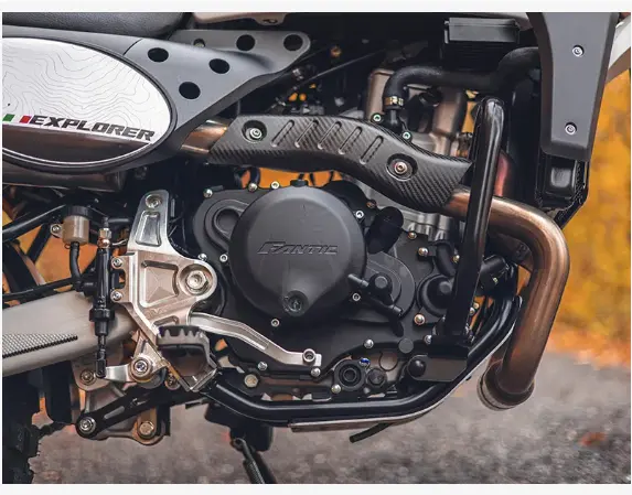El motor monocilíndrico de 4 válvulas, refrigerado por líquido e inyección electrónica de combustible ahora cumple con la normativa Euro5. Ofrece un gran rendimiento en el asfalto, combinado con eficiencia en pistas todoterreno. La unidad de control ECU tiene un mapeo actualizado, lo que garantiza una potencia del motor aún más suave en todas las revoluciones y también optimiza el rendimiento en términos de potencia máxima y par. El sistema de escape está fabricado en Italia por Arrow con silenciadores dobles cromados.