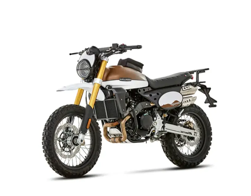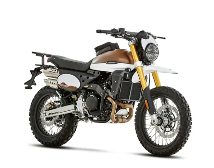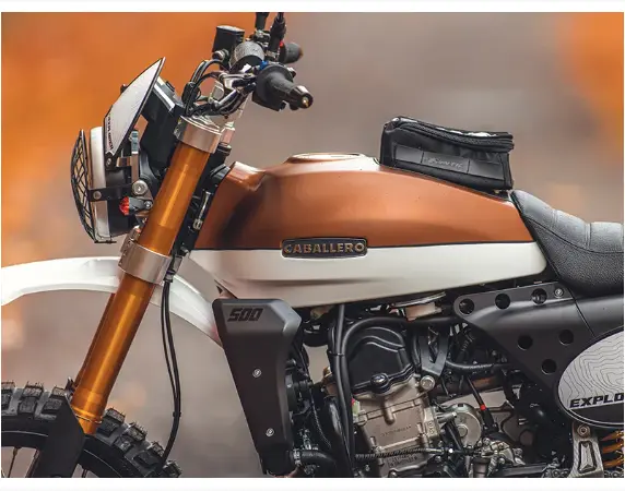 La Caballero Explorer ofrece muchas novedades para la aventura: manillar con barra transversal, guardabarros delantero, placa protectora del motor, rejilla de protección de los faros, placa porta números delantera, neumáticos off-road. Se han añadido otros accesorios nuevos, como la icónica bolsa sobre depósito, el bastidor porta bolsas trasero y el bastidor porta bolsas laterales junto con una bolsa lateral de 17 litros, las barras de protección laterales son ideales para proteger la moto incluso en las situaciones más extremas. Coloración única del depósito, un modelo bicolor donde los colores blanco y bronce están conectados por una línea negra que secciona longitudinalmente la tapa del depósito. Las nuevas placas laterales y frontales muestran un nuevo diseño gráfico creado específicamente para el modelo Explorer.