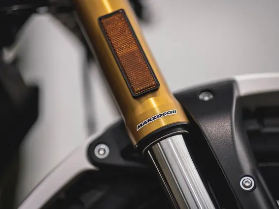 A primera vista, el Caballero 700 es fácilmente reconocible por sus líneas puras y simples, cuidadosamente elaboradas por el Centro Fantic Style. Elementos icónicos como el tanque rojo, los faros redondos y las placas de competencia amarillas en los paneles laterales se combinan con toques modernos como las placas del motor mecanizadas por CNC y las abrazaderas triples, y la protección de carbono del sistema de escape.